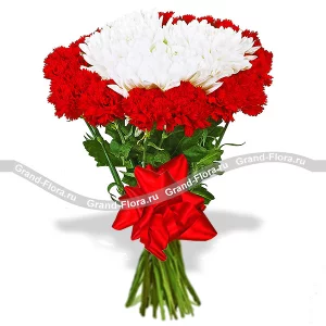 Триколор - композиция на оазисе из гвоздик и хризантем