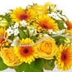 Уменьшенный: гербера желтая - 2 шт., роза желтая - 3 шт., хризантема белая кустовая - 2 шт., альстромерия белая - 2 шт., салал - 2 шт., упаковка.