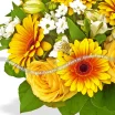 Стандартный: гербера желтая - 3 шт., роза желтая - 5 шт., хризантема белая кустовая - 3 шт., альстромерия белая - 3 шт., салал - 3 шт., упаковка.